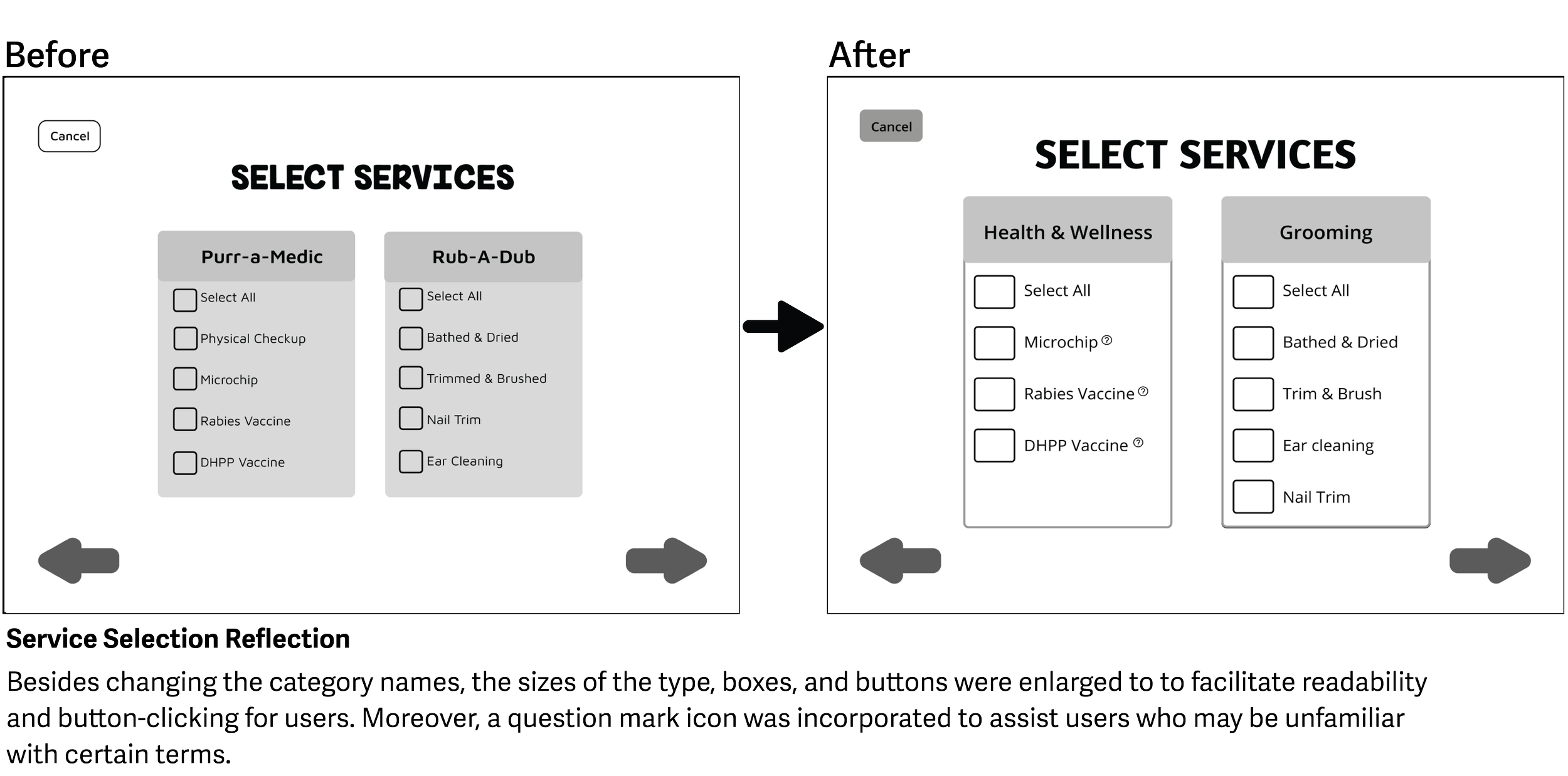 Once the user is on the “select services” page, they can start choosing their desired health and grooming services. To ensure transparency about what their pets will be receiving, a question mark feature was included for users to inquire about any unfamiliar vaccination or microchip. Additionally, users have the option to select only the services they want or need, as some may not require all of them.